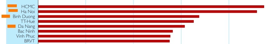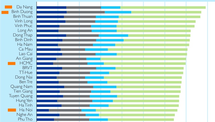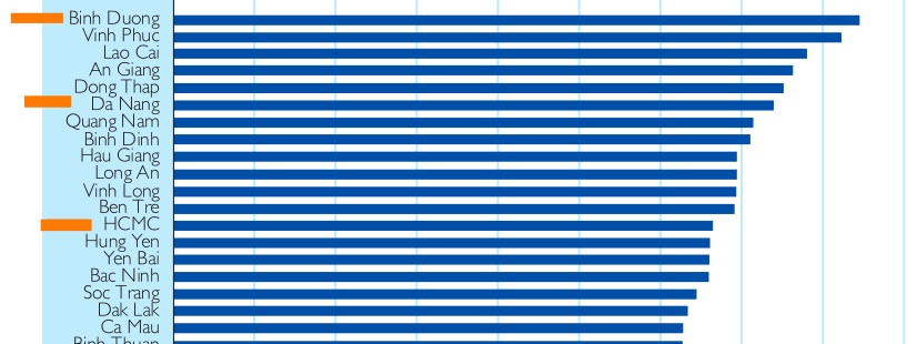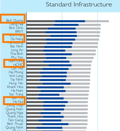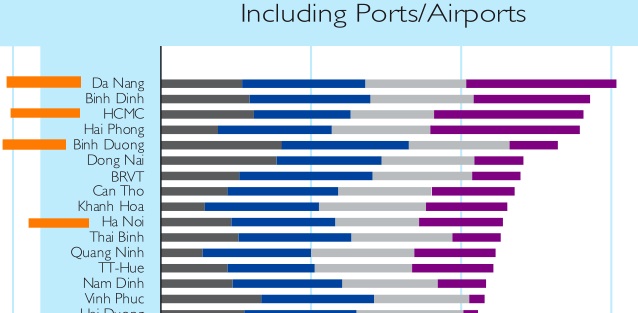 3.) Binh Duong is still the strongest in the Infrastructure Index; however, when comparing ports and airports and seaports access, it lost to Da Nang because it is an interior province with no provincial seaport and with no airport since it relies on Ho Chi Minh City international airport which is about a 45 minute drive away. A further fact to note here in comparing airports is that Danang airport is largely an internal airport with few international flights while Ho Chi Minh City International Airport is the country's largest and has the most flights to neighboring regions. Binh Duong remains top of the Index on Proactivity (which covers issue such as are the provincial officials knowledgeable enough about present national law to find opportunities within existing law to solve firm problems, and so on). Binh Duong was judged weaker than DaNang on its website, which made its score lower in the Transparency Index than DaNang, and on the ICT Readiness Index, Binh Duong lost out to Ho Chi Minh City and Hanoi but still exceeded DaNang.