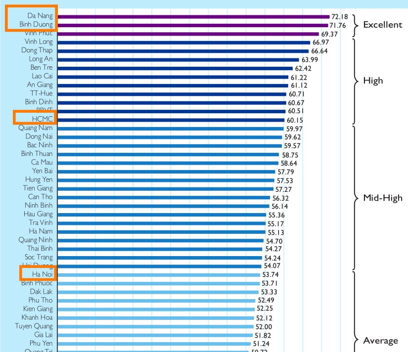 1.) Both provinces, Da Nang and Binh Duong, top the Excellent tier and their final scores (72.18 and 71.76) differ by less than half a point. Binh Duong, the PCI champion for the past three years, lost its crown to Da Nang, which had ranked second in all previous iterations. Da Nang is to be applauded for this but Binh Duong and Da Nang both remain top places to invest in Vietnam in 2008.