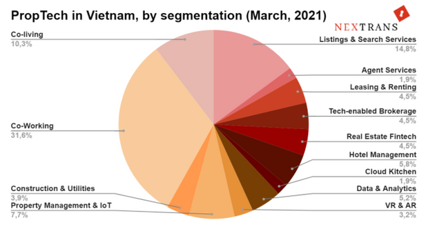 베트남 부동산협회에 따르면 2030년까지 베트남 부동산 시장 규모가 1조2320억 달러로 베트남 전체 경제 규모의 22%를 차지할 것으로 전망된다. 프롭테크는 전반적으로 부동산과 주택, 컨설팅 거래, 매매, 임대, 프로젝트 관리를 소개하는 웹사이트에 주로 사용된다. 베트남의 프롭테크 스타트업 분야는 아직 신생아 수준이지만 이 때문에 벤처 투자자들은 베트남 시장을 선점하기 위해 경쟁하고 있다. 2021년 기준 베트남에는 약 160개의 프롭테크 스타트업이 있는 것으로 추정되며, 이 중 80%가 외국계 기업이거나 외국인 투자자가 출자한 기업이다. 베트남의 프롭테크 유형 중 공유사무실사업(Co-working Space)과 공유 주거사업(Co-living)은 가장 주목 받는 분야이다. 이 두 유형은 현재 프롭테크 시장의 40%를 차지하며 매수자와 매도자, 투자자 모두 관심이 많은 분야이다.