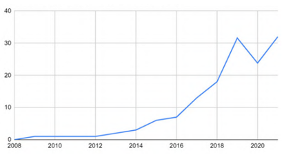 <전 세계 프롭테크 분야 외국인투자규모 추이(2008~2021)>