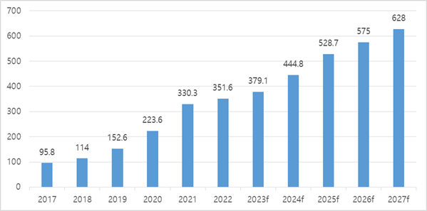 <2017~2027년 베트남 문구류 시장 규모 추이>